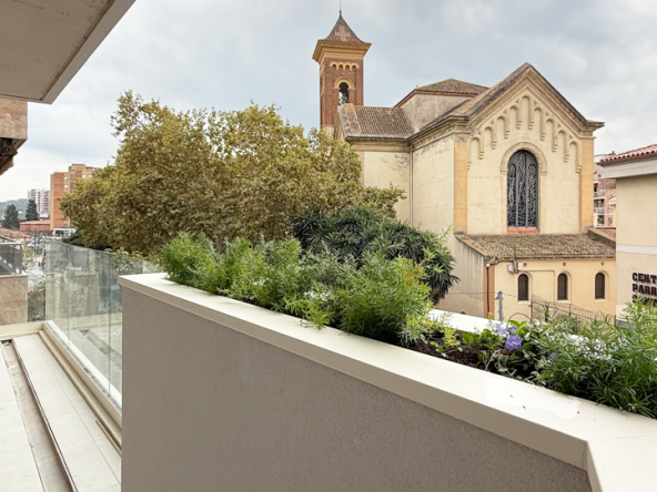 Cocina blanca donde la sensación de amplitud y luminosidad predominan. La encimera en color piedra rompe la armonía y aporta sensación de calidez.