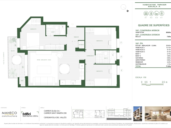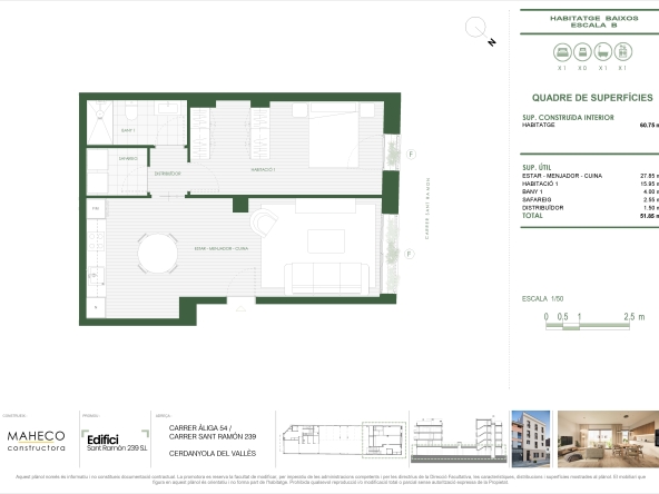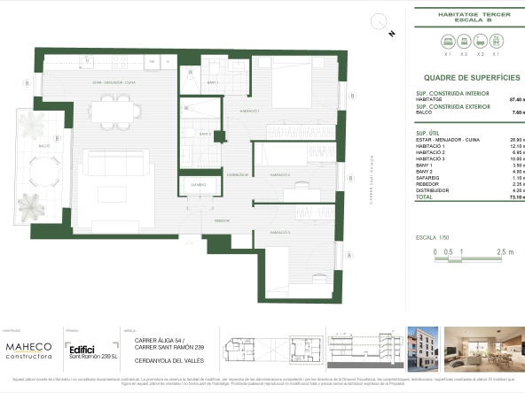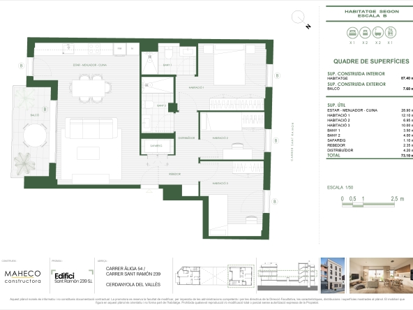 • Edificio plurifamiliar de 7 viviendas en Cerdanyola del Vallès con plaza de aparcamiento y trastero incluido. Ubicado en la calle Sant Ramon, 239 y Àliga, 54, este edificio residencial ofrece una oportunidad única para vivir en una zona tranquila y bien comunicada de Cerdanyola del Vallès. El edificio se compone de 7 viviendas distribuidas en planta baja y tres plantas piso, con acceso a través de dos escaleras independientes: - Escalera A, con entrada por C/ Àliga, 54 - Escalera B, con entrada por C/ Sant Ramon, 239 Hay dos tipologías de vivienda: - Vivienda de 1 dormitorio: 60,75 m2 , cocina tipo office, 1 baño y lavadero. - Viviendas de 3 dormitorios; Desde 85 m2 , cocina tipo office, 2 baños, terraza y lavadero. Disponen de plaza de aparcamiento y trastero incluido en el precio , garantizando funcionalidad y comodidad en un entorno moderno y acogedor. La promoción Sant Ramon se encuentra muy bien ubicada: - Rodeada de servicios básicos como farmacias, cafeterías, colegios, restaurantes y pequeños comercios de proximidad. - Excelente conexión con transporte público y rápido acceso a la C-58 y AP-7. - A pocos metros del supermercado Bonpreu. - A 6 minutos en coche de Sant Cugat del Vallès - A 8 minutos en coche de la estación de RENFE de Cerdanyola. - A 9 minutos de la estación de FGC de la Universitat Autònoma. Nuestro Departamento Comercial organiza visitas personalizadas en el showroom ubicado en nuestras oficinas (calle Camèlies, 13 de Cerdanyola del Vallès). Fecha prevista de entrega: 4to trimestre 2026. ¡En Maheco, hacemos realidad tu vivienda!