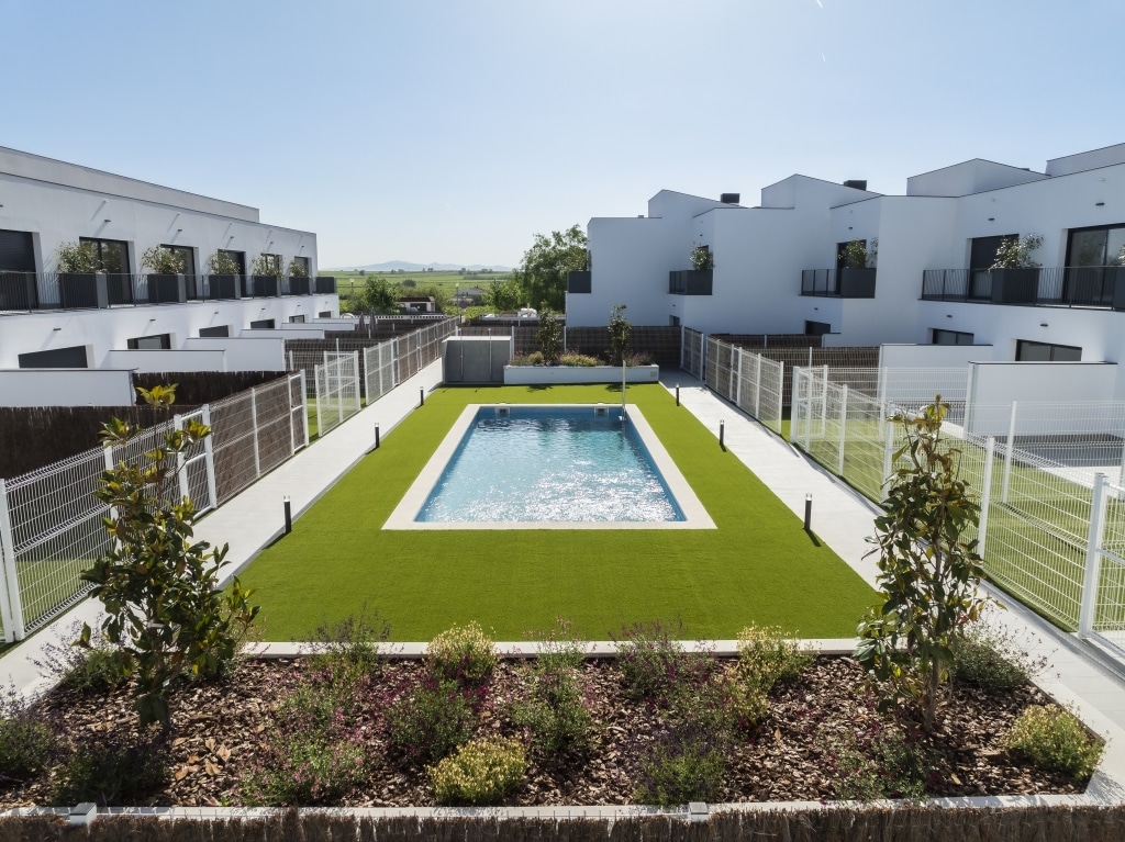 Las 22 casas adosadas dispuestas en forma de semicírculo cuentan con una zona ajardinada con piscina comunitaria, donde se accede desde las terrazas privadas de las viviendas. Esta distribución hace que cada vivienda goce de vistas hacia el área común, creando un entorno armónico y cohesivo.